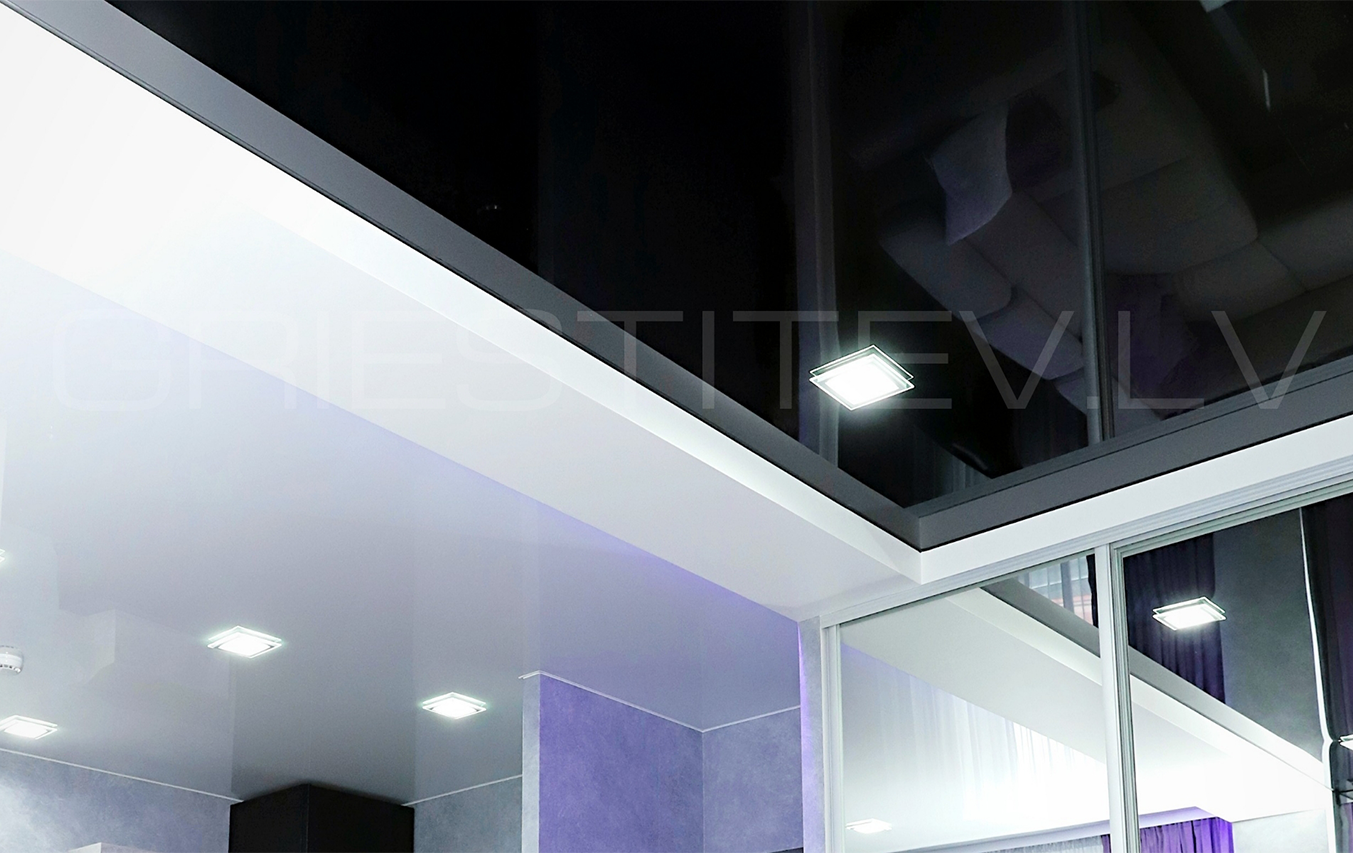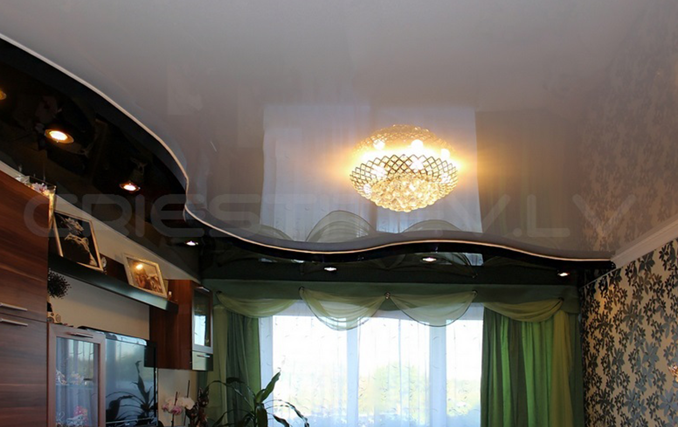 Lakotie nostieptie griesti ideāli noderēs vizuālai dzīvojamās telpas paplašināšanai. To nodrošina glancētas virsmas spoguļefekts, kurai piemīt atstarojoša īpašība. Pateicoties tā saucamajam "spogulim", istaba kļūst ne tikai plašāka, bet arī gaišāka. Un jo griestu tonis ir tumšāks, jo labāks interjera priekšmetu atspulgs veidojas.
