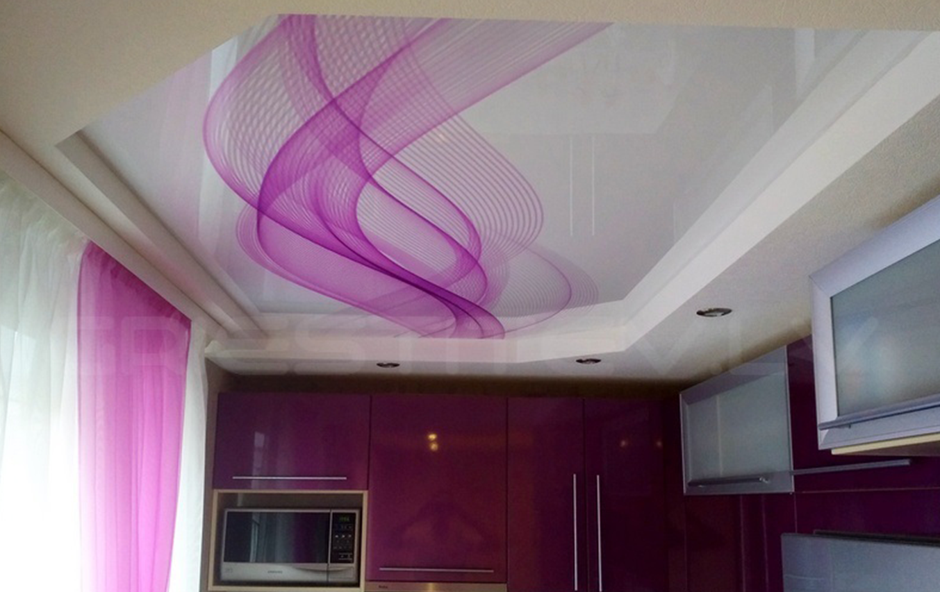Глянцевый потолок, как видно фото, выглядит невероятно роскошно, подчеркивая высокий статус своего владельца. Он непременно станет акцентом в оформлении всего интерьера комнаты, привнесет в нее дополнительный уют и комфорт, а также обязательно украсит ее;